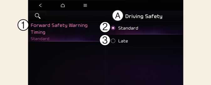 With the vehicle on, touch Settings → Vehicle → Driver Assistance→ Driving Safety → Forward Safety Warning Timing on the infotainment system to change the initial warning activation timing of Forward Collision-Avoidance Assist.