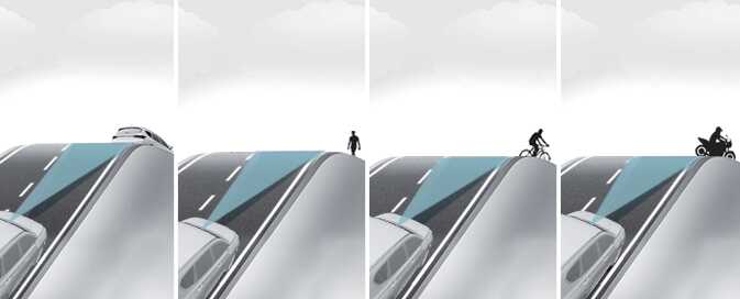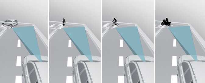 The illustration above shows the image the front view camera and front radar are capable of detecting as a vehicle, powered two-wheeler, pedestrian and cyclist.