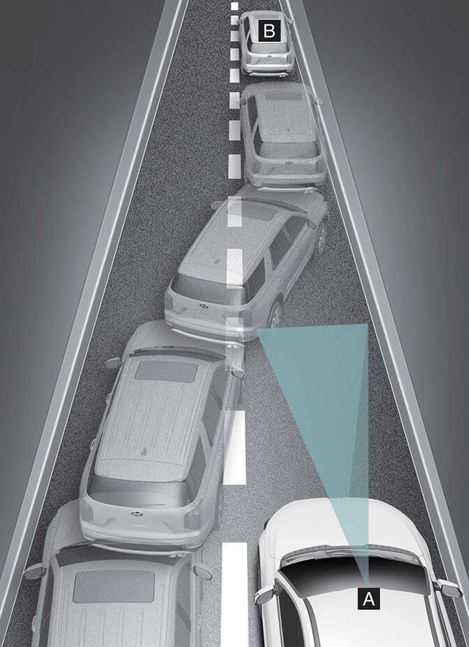 When a vehicle (B) moves into your lane from an adjacent lane, it cannot be detected by the sensor until it is in the sensor's detection range.