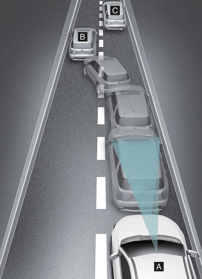 When a vehicle (B) in front of you merges out of the lane, Forward Collision-Avoidance Assist may not immediately detect the vehicle (C) that is now in front of you. In this case, you must maintain a safe braking distance, and if necessary, steer your vehicle and depress the brake pedal to reduce your driving speed in order to maintain a safe distance.