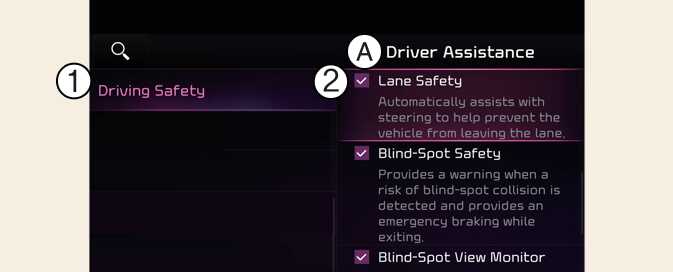 Lane Safety: If Lane safety is selected, Lane Keeping Assist will automatically assist the driver's steering when lane departure is detected to help prevent the vehicle from moving out of its lane. If Lane safety is deselected, the indicator light (