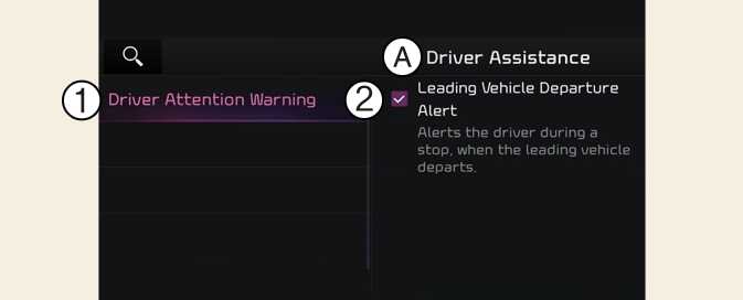If Leading Vehicle Departure Alert is selected, the function will inform the driver when a detected vehicle in front departs from a stop.