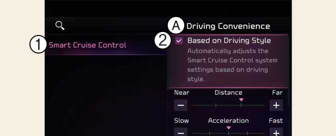 With the vehicle on, if Settings → Vehicle → Driver assistance → Driving convenience → Smart Cruise Control → Based on Driving Style is selected from the infotainment system screen, Smart Cruise Control will operate based on the driver's driving style, such as vehicle distance, acceleration, reaction speed.