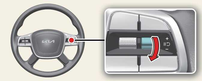 Push the (-) switch down and hold it. The set speed will decrease by 5 mph (10 km/h) each time the switch is operated in this manner.