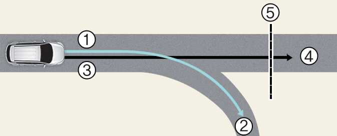 When the vehicle's driving route is recognized as the main road by maintaining the main road instead of the navigation set route, Highway Curve Zone Auto Slowdown function will operate. Depending on the distance to the curve and the current vehicle speed, vehicle deceleration may not be sufficient or may decelerate rapidly.