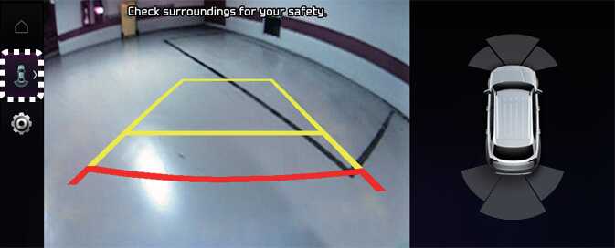 Pressing the Parking/View button (1) again while P (Park) gear position is selected with the rear view on the screen.