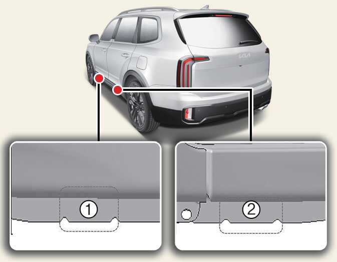 Place the jack at the front (1) or rear (2) jacking position closest to the tire you are changing. Place the jack at the designated locations under the frame. The jacking positions are plates welded to the frame with two tabs and a raised dot to line up with the jack.