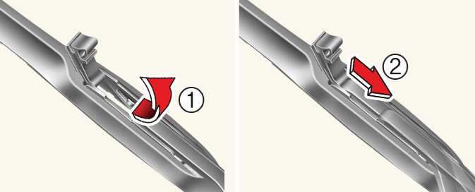 Lift up the wiper blade clip (1). Then pull down the blade assembly and remove it (2).