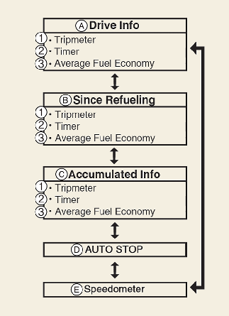 This display shows the trip distance, the average fuel efficiency, and the instant fuel efficiency (or the total driving time) since refueling.