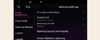 Select Settings → Vehicle → Driver assistance on the infotainment system screen to set the Driver Assistance function.