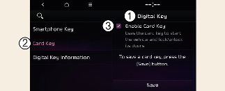 When there is a digital key (card key) already saved in the vehicle, the Save menu is disabled. If you want to save a digital key again, refer to More Details and follow the deleting procedure first before saving a digital key.