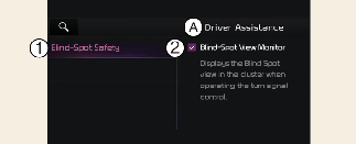 With the vehicle on, select Driver Assistance → Blind-Spot Safety → Blind-Spot View Monitor from the Settings menu to turn on Blind-Spot View Monitor and deselect to turn off the function.