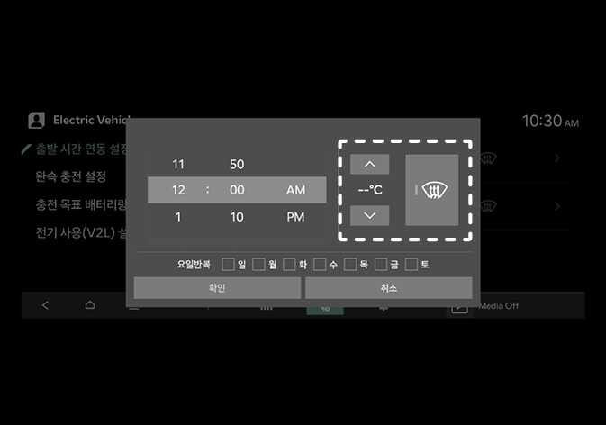겨울철 충전 케이블이 연결된 상태에서 예약 공조를 통해 희망 온도를 설정하면 구동용(고전압) 배터리 충전량 손실 없이 실내 난방이 가능하며, 구동용(고전압) 배터리 내부 온도를 올려 전기차 성능을 높이는 데에 도움을 줄 수 있습니다.