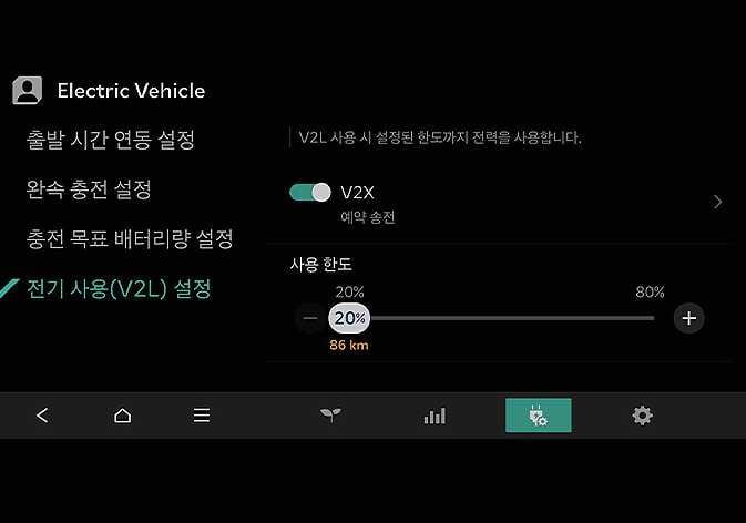 인포테인먼트 시스템 화면의 아이콘을 선택한 후 전기 사용(V2L 설정)을 선택하면 구동용(고전압) 배터리의 사용 한도(%)를 설정할 수 있습니다. |