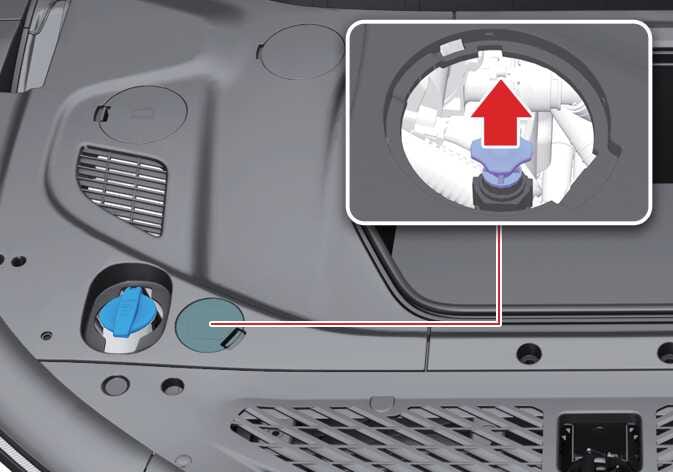 배터리의 방전 및 차량의 전기 배선 이상으로 인해 충전 커넥터가 분리되지 않을 때는, 모터룸 내부에 위치한 비상용 고리를 가볍게 당기면 충전 인렛 잠금 장치의 잠금이 해제됩니다. |