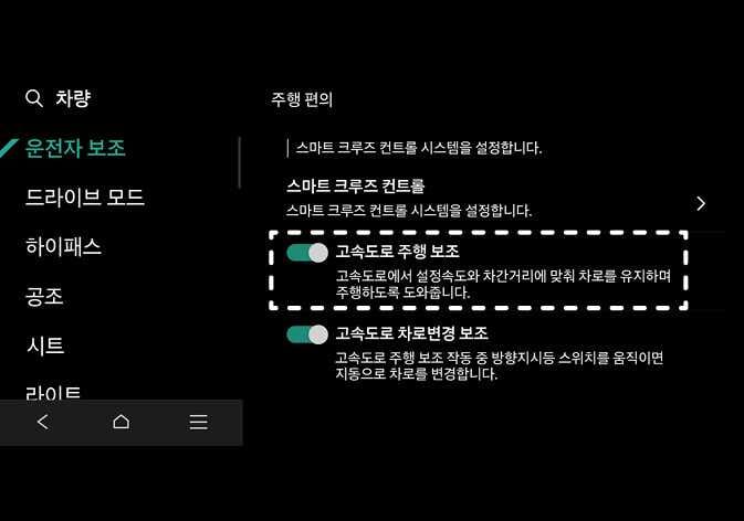 고속도로 주행 보조 N_CT25Z215 DRIVE READY 상태에서 인포테인먼트 시스템의 설정 > 차량 > 운전자 보조 > 주행 편의를 차례로 선택하십시오. 각 기능의 사용 여부를 설정할 수 있습니다. 고속도로 주행 보조를 선택하면 전방 차량과의 거리와 설정속도를 유지하며 차로 중앙을 주행하도록 도와줍니다.