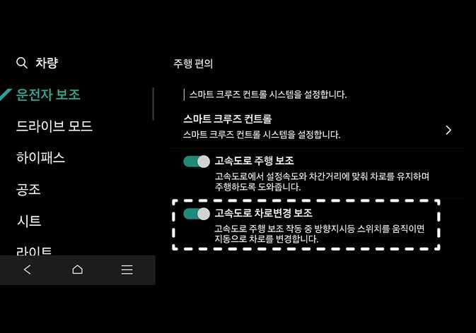 고속도로 차로변경 보조 기능을 선택하면 안전하게 차로를 변경하도록 도와줍니다.