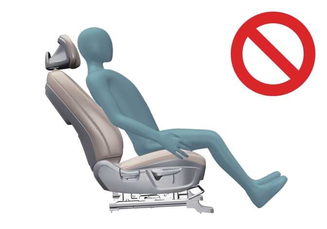 좌석 등받이 각도를 지나치게 기울이면 탑승자의 엉덩이가 충돌이나 급정차 시에 안전벨트의 아랫부분으로 빠져나올 수 있습니다. 이럴 경우, 탑승자는 안전벨트에 의해 더 이상 고정되지 않고 안전벨트가 복부나 목을 조여 심각한 부상이나 사망을 초래할 수 있습니다.