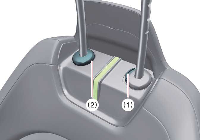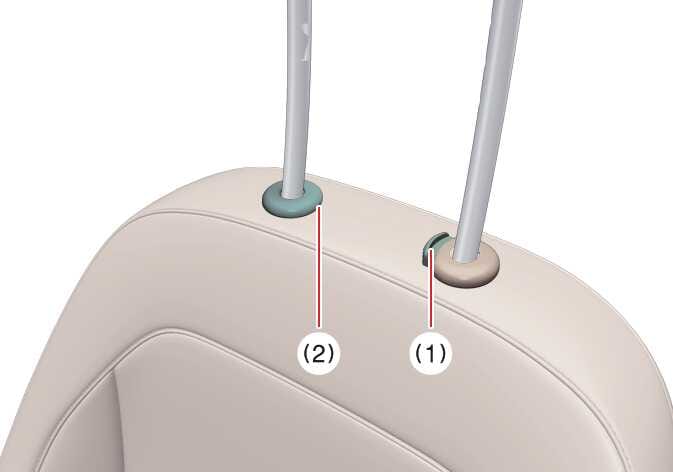 잠금 해제 버튼(1)을 누른 상태에서 핀 또는 얆은 물체를 이용해 잠금 해제 홀(2)에 넣어 누른 후 헤드레스트를 위로 당기십시오. 헤드레스트를 위로 올려 분리하십시오.