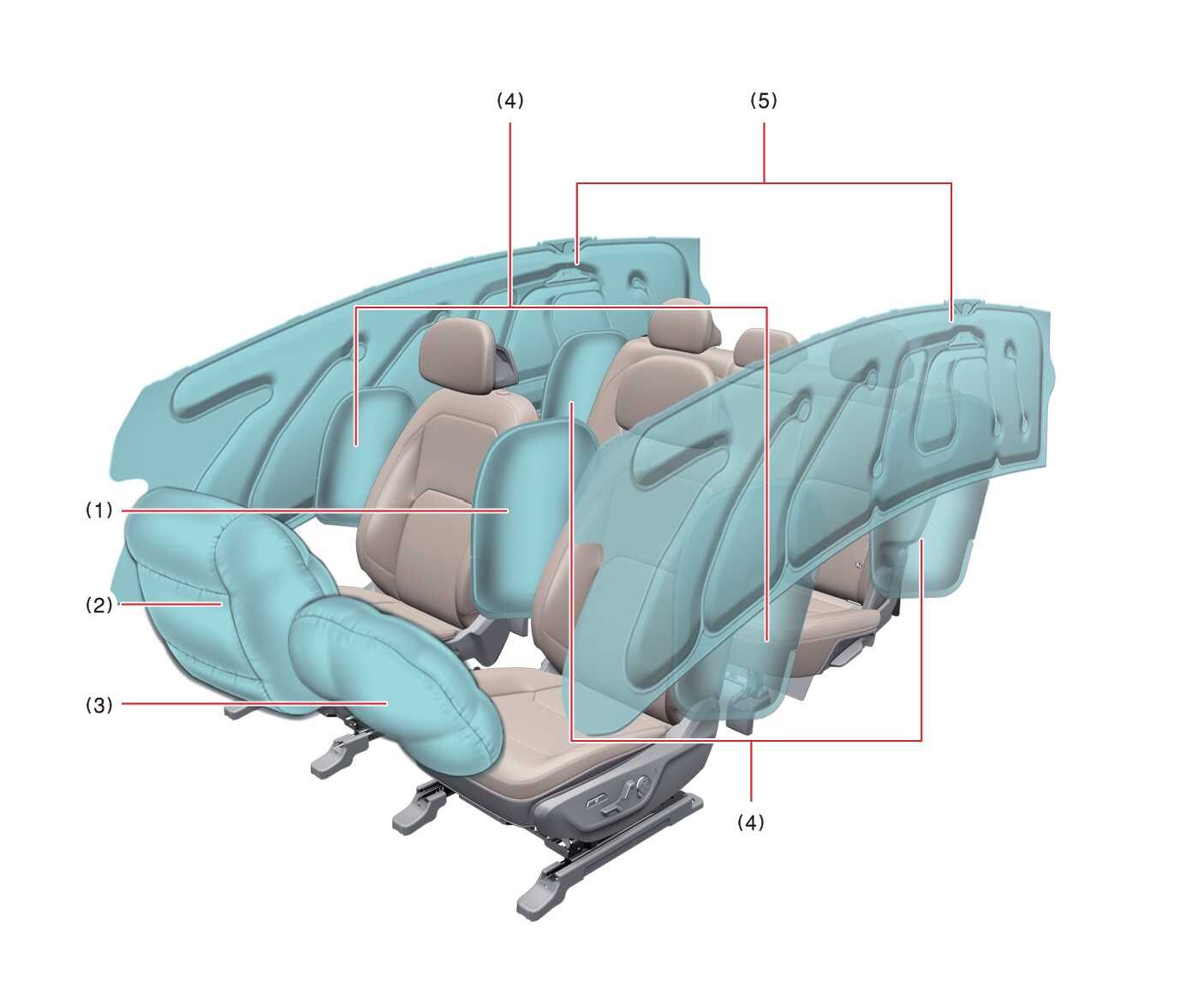 에어백(보조 구속 장치) OOV025094 에어백 종류 앞좌석 센터 사이드 에어백 동승석 에어백 운전석 에어백 사이드 에어백 커튼 에어백 위의 그림은 실제 차량에 적용된 에어백의 형상과 다를 수 있습니다.
