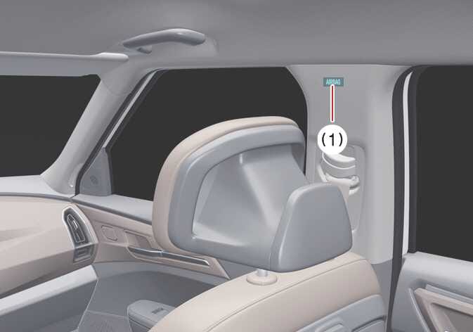 커튼 에어백(1)은 양쪽 도어 위쪽의 천장 끝에 내장되어 있습니다. 에어백 작동 조건이 되면 앞좌석과 뒷좌석 도어 쪽 탑승자의 머리를 보호하기 위해 작동합니다.