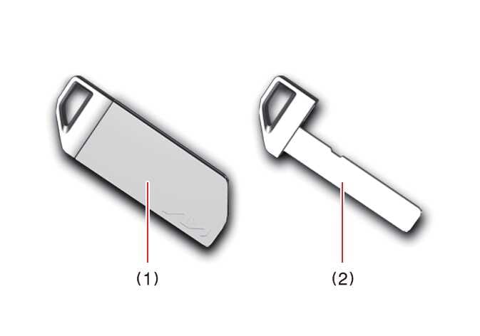 스마트키 배터리 방전 등, 스마트키가 정상적으로 작동하지 않을 경우, 비상 키(2)를 이용하여 도어를 잠그거나 잠금 해제할 수 있습니다.