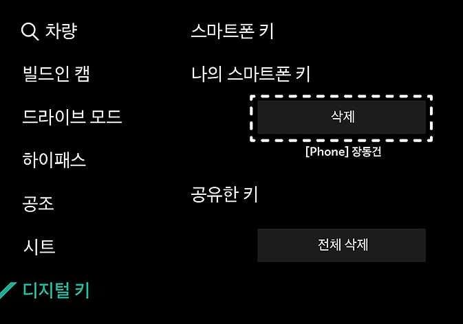 스마트폰에서 디지털키 2를 삭제하면 차량에 등록된 디지털키 2(스마트폰)도 삭제됩니다.