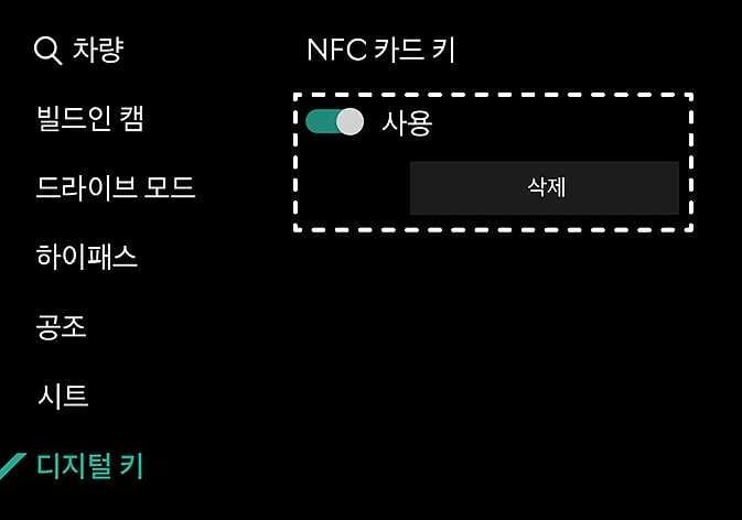 인포테인먼트 시스템에서 를 선택한 후 카드 키를 삭제하십시오. 등록된 디지털키 2(카드 키)가 없으면 삭제 메뉴가 비활성화됩니다.