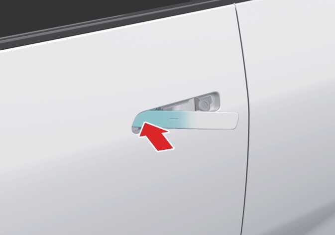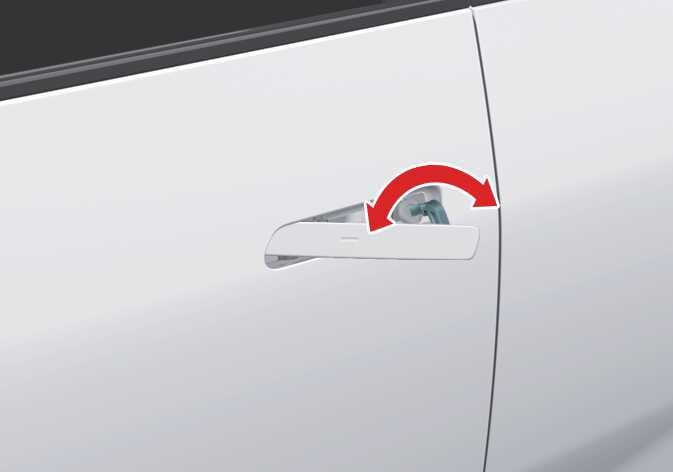 실외 도어 손잡이 앞부분을 누르면 뒷부분이 나옵니다. 앞부분을 누른 상태에서 비상 키를 키 홈에 꽂고 좌우로 돌려 운전석 도어를 잠그거나 잠금을 해제할 수 있습니다.