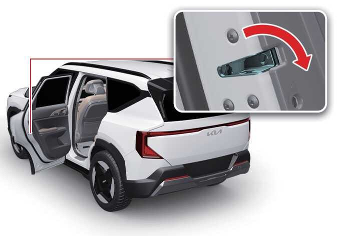 도어가 잠기고 시동 POWER ON 또는 DRIVE READY 상태에서 충돌 센서에 충돌 감지 시 도어 잠금 장치가 자동으로 해제됩니다. 단, 도어 잠금 해제 장치 또는 배터리에 문제가 있을 경우 도어가 잠금 해제되지 않습니다.