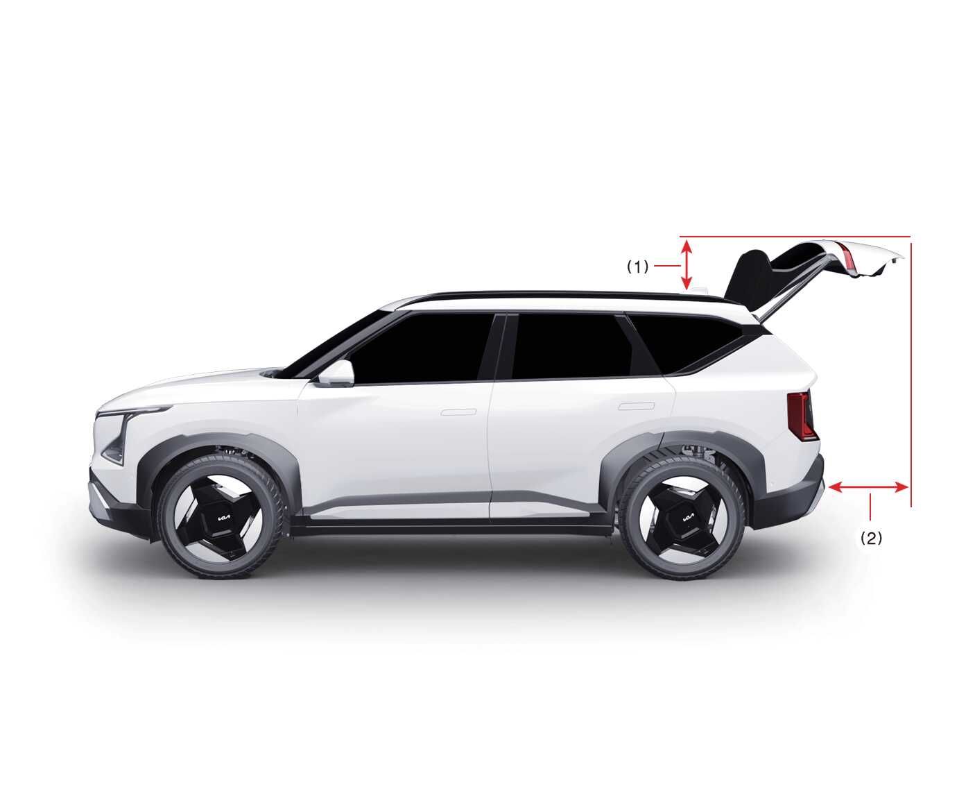파워 테일게이트(또는 스마트 테일게이트)를 안전하게 열거나 닫을 수 있도록 차량 주변에 최소 여유 공간을 확보하십시오. 최소 공간이 확보되지 않은 상태에서 파워 테일게이트를 작동하면 테일게이트가 주변의 물체(벽, 천장, 주변 차랑 등)에 부딪쳐 손상될 수 있으며, 주변 사람에게 부상을 입힐 수 있습니다.