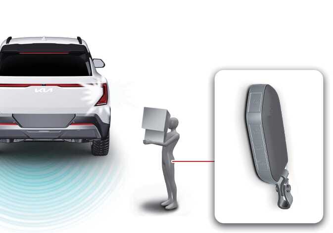 스마트키를 휴대하고 테일게이트 후방 감지 영역 약 50~100 cm 이내 접근하여 3초 이상 대기 시 (감지 영역 진입 시 비상 경고등 및 경고음 작동)