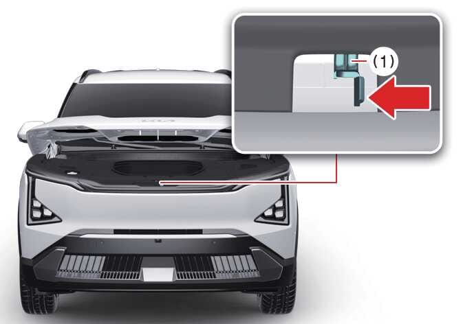 차량의 앞에서 후드를 약간 들어 올리고, 중앙에 위치한 2차 열림 레버를 왼쪽으로 밀고 있는 상태(1)에서 후드를 위로 들어 올리십시오.