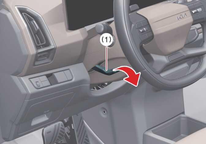 위치를 조절할 때는 조절 레버(1)를 아래로 밀어 내린 상태에서 스티어링 휠의 높낮이와 앞뒤 위치를 조절하십시오. 조절 후에는 조절 레버를 원위치한 다음 스티어링 휠을 흔들어 확실하게 고정되었는지 확인하십시오.