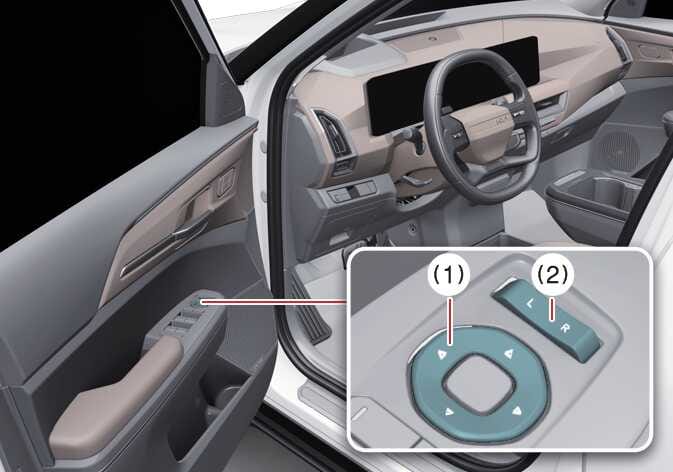 미러 조절 선택 스위치(2)를 왼쪽(L)으로 미십시오. 미러 조절 스위치(1) 부분을 눌러 실외 미러를 조절하십시오.