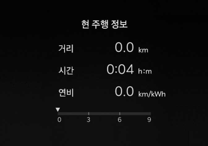차량 주행 1회 동안의 거리/시간/전비가 표시됩니다. 시동을 끄고 운전석 도어를 열거나 약 3분이 지나고 시동을 다시 걸면 정보가 자동으로 초기화됩니다. 시동 OFF 후 약 3분 이내에 시동을 다시 걸 경우 초기화되지 않습니다.