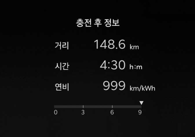 충전한 이후의 누적 주행 거리/시간/전비가 표시됩니다. 정보를 초기화하려면 스티어링 휠의 OK 버튼을 길게 누르십시오.