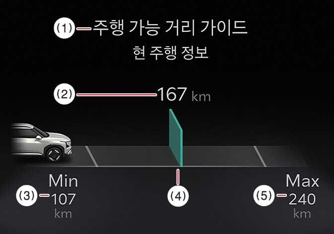 과거 주행 기록을 기반으로 현재 남은 배터리로 주행할 수 있는 '주행 가능 거리'(2)와 이번 주행 시작 후 전비를 기반으로 현재 남은 배터리로 주행할 수 있는 '예상 거리'를 계산하여, 이번 주행에서의 에너지 절약 정도를 초록색 혹은 주황색의 막대(4)로 표시합니다.