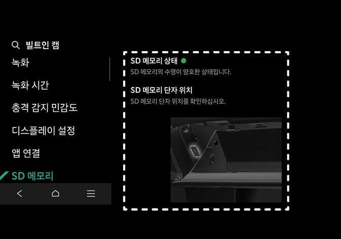 녹화 영상 저장을 위한 SD 메모리의 수명 상태, SD 메모리 단자 위치를 확인할 수 있습니다.