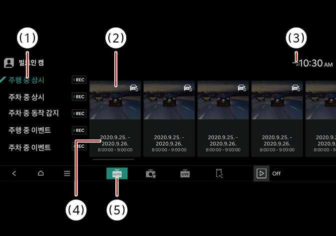 (1) 탭 메뉴 (2) 녹화된 영상 썸네일 목록 (3) 빌트인 캠 상태 표시등 (4) 녹화된 영상의 날짜 및 시간 (5) 메뉴 구성 |