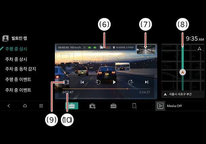 녹화 위치: 내비게이션 지도상에 영상이 녹화된 위치를 표시, 터치하여 원하는 위치로 이동