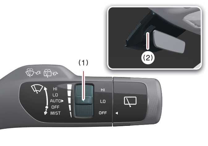 OOV035422차 안 중앙 앞유리 상단에 설치된 센서(2)에서 비의 양을 감지하여 비의 양이 많아지면 와이퍼 작동 속도가 빨라지고, 비의 양이 적어지면 느려지다가 비가 멈추면 작동도 멈춥니다. 와이퍼 속도 조절을 변경하고자 할 때는 속도 조절 노브(1)를 돌려 조절할 수 있습니다. 위쪽으로 돌리면 속도가 빨라지고 아래쪽으로 돌리면 속도가 느려집니다. POWER ON 상태에서 와이퍼 스위치를 AUTO 위치로 돌리거나, AUTO 위치에서 속도 조절 노브를 아래 방향으로 돌리면 시스템 확인을 위하여 와이퍼가 1회 작동합니다. 와이퍼의 작동이 필요하지 않을 때는 항상 스위치를 OFF 위치에 두어 와이퍼를 멈추십시오.