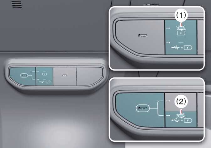 POWER ON 또는 DRIVE READY 상태에서 USB 버튼(1)을 누른 후 USB 데이터/충전 단자 표시등(2)이 켜지면 USB 데이터/충전 단자를 이용할 수 있습니다.