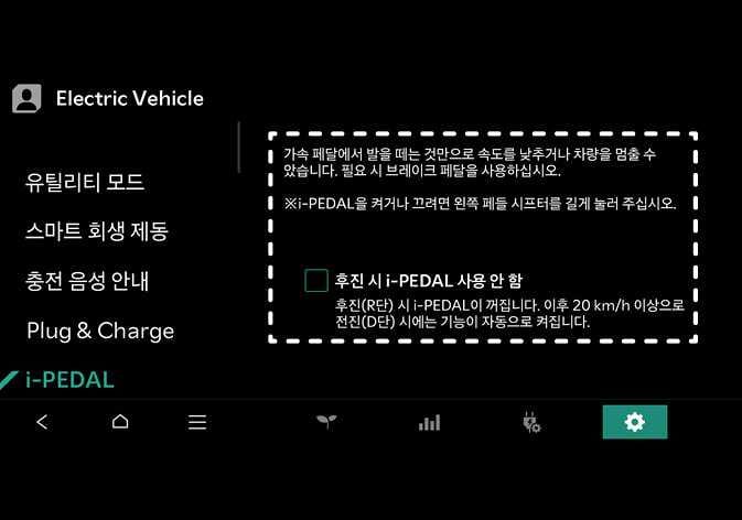 인포테인먼트 시스템의 에서 후진 시 아이 페달 사용 여부를 선택할 수 있습니다.