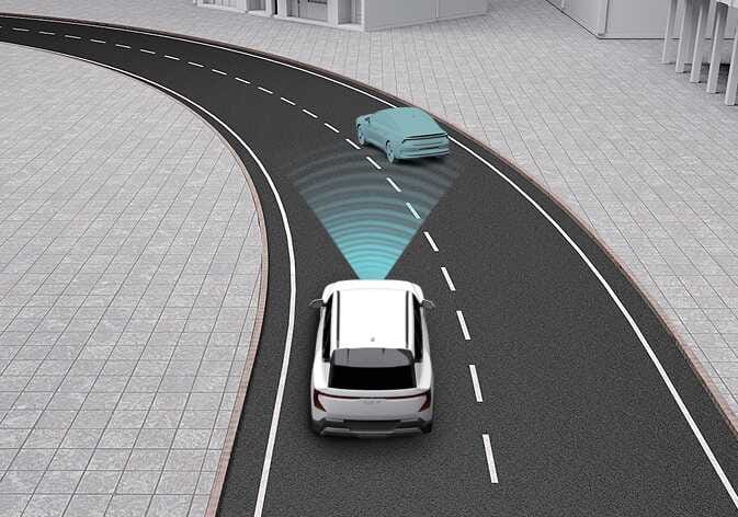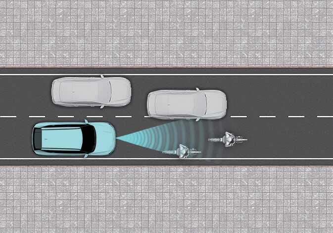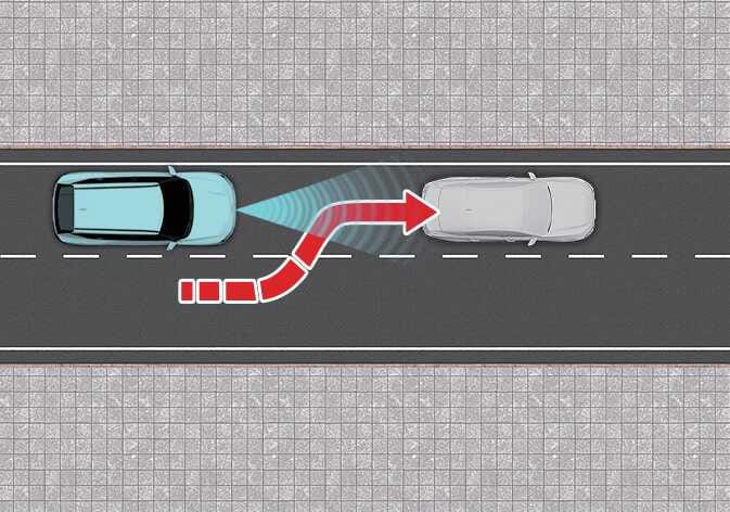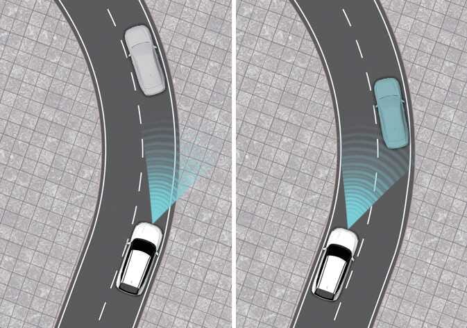 옆 차로의 차량이 같은 차로 앞으로 들어올 때 센서의 감지 범위 안으로 들어올 때까지 전방의 차량을 인식하지 못할 수 있습니다. 갑자기 끼어드는 차량은 센서가 늦게 인식할 수 있으니, 항상 주의를 기울이십시오. |