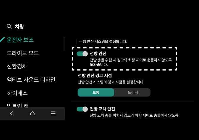 전방 안전: 충돌 위험 상황에 따라 충돌 경고 또는 긴급 제동이 작동합니다. 해당 메뉴를 해제할 경우 전방 안전 기능이 꺼지고 클러스터에 전방 안전 경고등