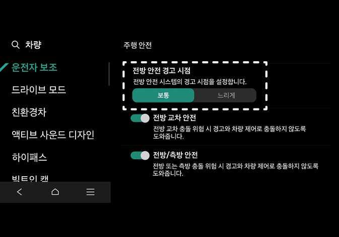 경고 시점을 보통으로 설정해도 전방 차량이 급제동하는 경우에는 경고가 느리게 느껴질 수 있습니다.