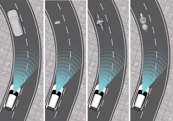 OOV055029_4커브가 있는 길에서는 전방에 있는 차량, 이륜차, 보행자 및 자전거 탑승자를 인식하지 못해 전방 충돌방지 보조의 성능이 저하되어 경고, 제동 또는 조향(사양 적용 시)을 도와주지 않을 수 있습니다.
