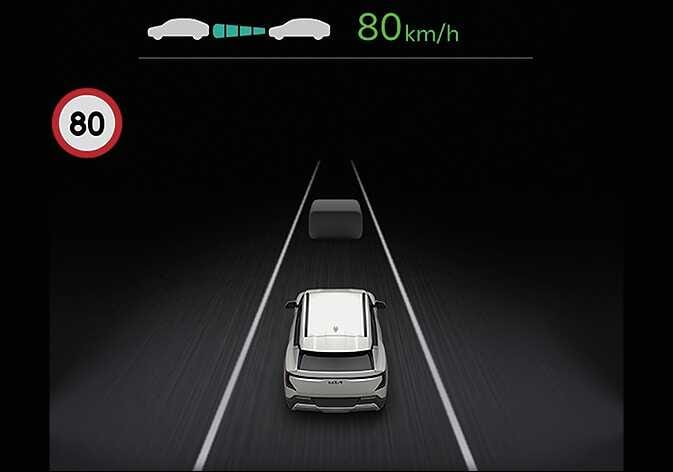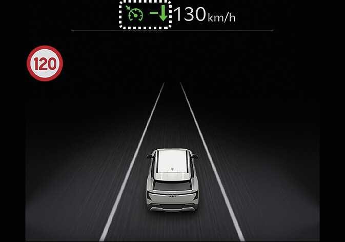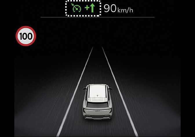 수동 속도 제한 보조 또는 스마트 크루즈 컨트롤 작동 시, 운전자가 설정속도를 도로의 제한속도에 맞추면 자동 설정속도 조절 기능이 활성화되며 클러스터의 설정속도가 초록색으로 표시됩니다. 이후 제한속도가 변경되면 여기에 맞춰 자동으로 설정속도를 조절해 줍니다.