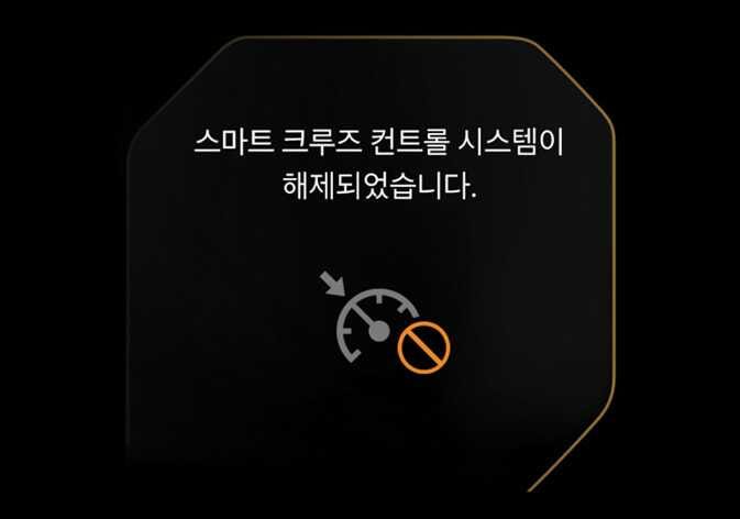스마트 크루즈 컨트롤이 해제되면 전방 차량과의 간격이 유지되지 않습니다. 전방 도로 상황 및 주행 상태를 확인하고 필요하면 브레이크 페달을 밟아 차량 속도를 직접 조절하십시오.